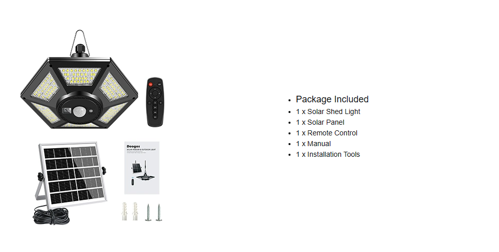 | المكونات المضمنة | Solar Panel, Remote Control, Mounting Hardware, Light Fixture |